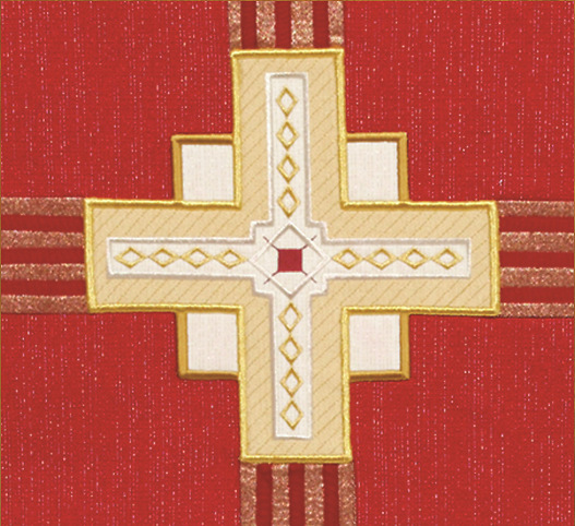 As part of the Kingdom Cross Parament Series, this attractive Red Pulpit/Lectern Scarf with the symbol of the cross is crafted of fine imported English wool, highlighted with distinctive silk and metallic thread embroidery and complementary cording. Choose this cross symbol or symbol of the dove to match the symbol on your table runner or altar frontal. The Pulpit/Lectern Scarf measures 20” x 42”, including 20” drop, but can be custom ordered to fit your pulpit/lectern.