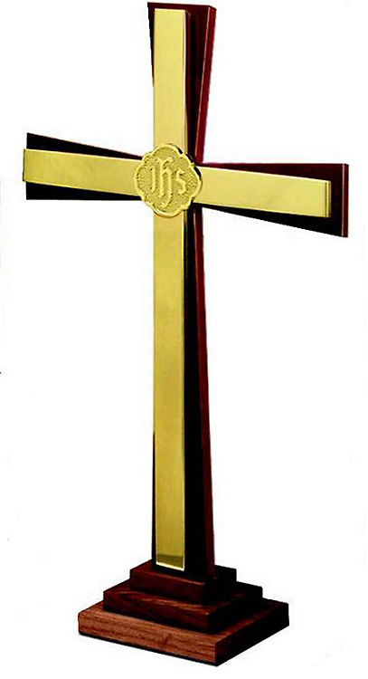 A unique blend of wood and brass draw the eye to your altar. This striking Cross is presented in hand-selected, hand-polished walnut wood with luxurious bright finish brass accents and overlay for stunning beauty; the base is hand-polished walnut wood. At the apex of the cross is an “IHS" emblem etched in a gold round medallion. This Cross can be purchased individually or as part of a set, which includes a pair of 8 1/4" Candlesticks and a pair of 10 1/4" Vases with liners.