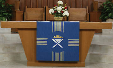 This striking Altar Antependium in blue, symbolizes love and truth. It features material of fine imported English wool, highlighted with distinctive silk and stunning metallic thread embroidery of the Manger and complementary cording. Antependium is 30” wide, 60” long which includes a 30" front drop.