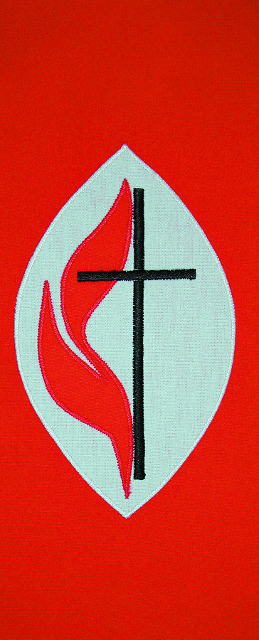 Constructed of a variety of elegant fabrics this brilliant red stole features the United Methodist Cross and Flame white a white band across the bottom. Dry clean only. Made in the USA.
