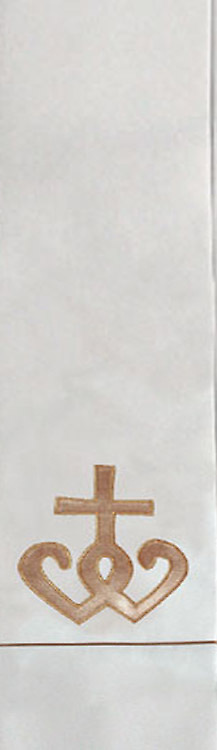 Our beautiful White Stole with Gold Crown of Hearts features an appliqued golden Crown of Hearts with Gold Cross and gold piping on each panel set on a white background. This stole has a smooth finish made from woven suraline polyester and features an interlining for body and stability. It is sure to be a favorite in your vestment collection! Made in USA!