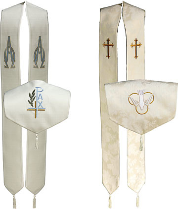 Two occasion celebrations in one! Tunic overlay stole with back shoulder panel. A unique reversible stole with six embroideries. One side is damondweave polyester with Alpha & Omega symbol on the front panels and Pax, cross and olive branch embroidered on back panel. The traditional Latin cross is on the reverse side on ivory davenport tapestry with a dove embroidered on the back panel.