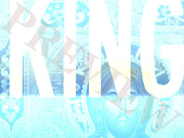 This is a download still for use in worship as a background slide showing Christ's face in shades of light blue and light green with the word "KING" reversed out in white bold letters, this is a download purchase item.