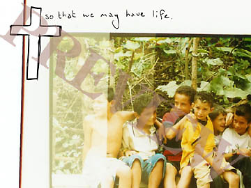 This is a download still for use in worship as a background slide showing a group of children and a cross, download purchase item.