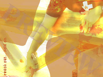 This is a download still for use in worship as a background slide showing two people holding hands over a fence, with a yellow screen, words "Reach Out Hold On," download purchase item.
