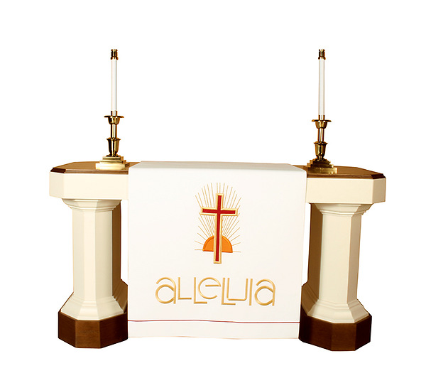 This antependium exclaims Alleluia and features a sunburst behind a cross. It gives a visual focus to your joyous Easter Celebration of the Risen Christ! Standard dimensions are 30" wide x 60" deep (60" includes a 30" front drop). Can be ordered in custom sizes. Please call our custom sales team at 1-800-237-7511 for assistance. Made in the USA.