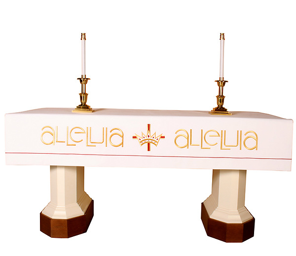 “Alelluia! Alleluia” is embroidered on this altar frontal with the image of the Cross and Crown. Base fabric is crafter from Cathedral fabric with woven linen texture. Stock measurement is 72” long x 30” self fabric depth, plus a 14” drop. Can also be ordered in custom izes. Please call our custom sales department for assistance at 1-800-237-7511.