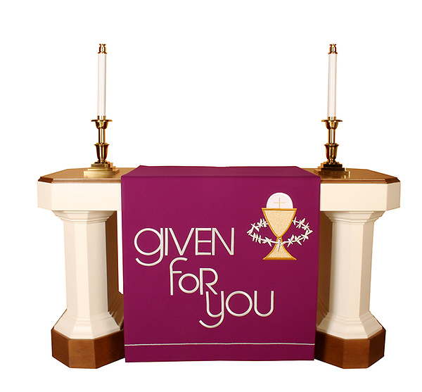 This antependium reminds us of the Last Supper with the phrase “Given for you.” This Lenten themed parament features bread and chalice along with a crown of thorns. Stock measurements are 30" wide x 60" deep (60" includes a 30 front drop).