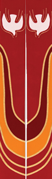 This red stole is part of the Ascension Series of paraments and stoles--all of which are perfect for celebrating seasons of the Christian year. The stole is made of cathedral fabric; red is the liturgical color for Pentecost. It features a white descending dove and accent fabric of red, orange, and burgunday. The stole is 110” x 5”.