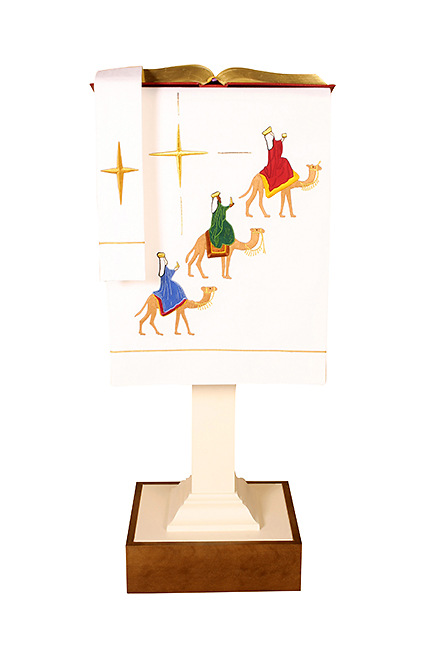 This scarf features the three Wise Men on their way to seek the new born King. It also displays the Star Cross, which appears on all the pieces in this Christmas parament set. Standard size is 20” wide x 42” deep (42” depth includes a 24” front drop). Custom sizing available. Please call our custom sales department at 1-800-237-7511 for assistance. Made in the USA.