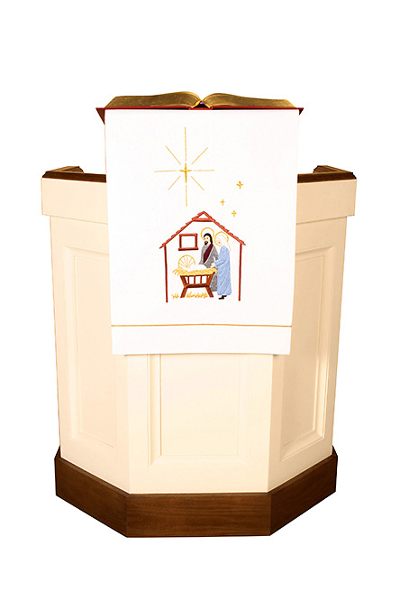 As with all the pieces in the Advent parament set, this scarf features the Star Cross. This time it appears above the image of the Nativity showing those searching where they can find Jesus. Standard size is 20” wide x 42” deep (42” depth includes a 24” front drop). Custom sizing available. Please call our custom sales department at 1-800-237-7511 for assistance. Made in the USA.