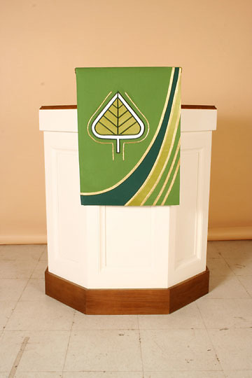 This scarf, along with its partner, celebrate the season in the Christian year known as Ordinary Time and symbolizes growth and God's continuing presence. It features a leaf and accent fabrics of elm, hunter and olive green. 20” wide x 42” long including 24” front drop.