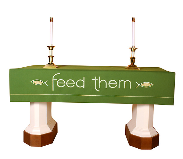 “Feed them” is embroidered on this altar frontal with the image of two fish. This frontal is 72” long x 30” self fabric depth, plus a 14” drop. Also available in custom sizes. Please call our custom sales team at 1-800-237-7511 for assistance. Made in the USA.