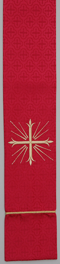 This red bookmark features a large Greek cross with sunburst design embroidered and outlined in gold. A traditional gold braid trim at the bottom of it accents the design. The Bookmark measures 3 1/2" x 36”.