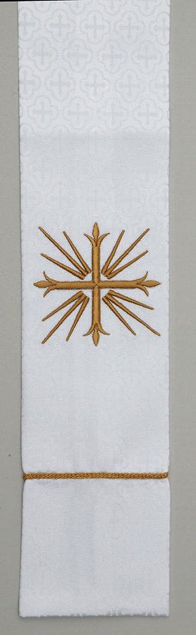 This white Boomark features a large Greek cross with sunburst design embroidered and outlined in gold. A traditional gold braid trim at the bottom of it accents the design. The Bookmark measures 3 1/2" x 36”. Made in the USA.