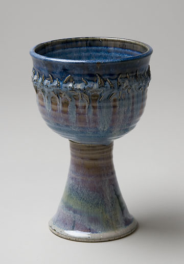 Each piece is handmade, so no two are exactly alike. This chalice is 9 1/2" tall and holds 30-32 oz..