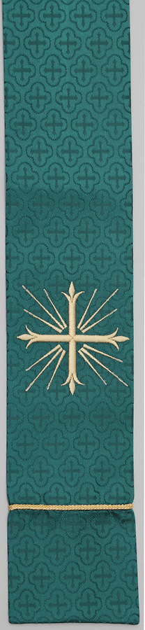 This green Bookmark features a large Greek cross with sunburst design embroidered and outlined in gold. A traditional gold braid trim is at the bottom to accent the design. The Bookmark measures 3 1/2" x 36”.
