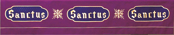 This purple Superfrontal features the words “Sanctus, Sanctus, Sanctus” (Holy, Holy, Holy) embroidered and outlined in gold. The Greek Cross with sunburst rays provide richness to this striking and modern look given to the traditional symbols. Standard sizing is 72” long x 30” deep, plus a 14” front drop. Superfrontal uses a white linen fabric on the table top portion of frontal instead of matching cathedral fabric used on the front. This is done to make it a little less expensive than a standard altar frontal. Made in the USA.