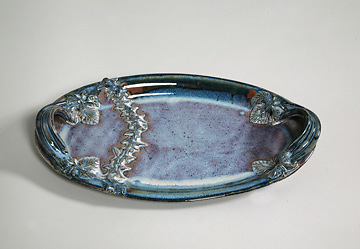 This handcrafted earthenware loaf server is unique in design with the addition of handles, making it easier for those serving Communion. It is hand decorated with grape leaves and crown of thorns in raised relief. A glaze technique using varying shades of pastel colors gives each piece its own unique, porcelain-like look in a pastel blue finish.