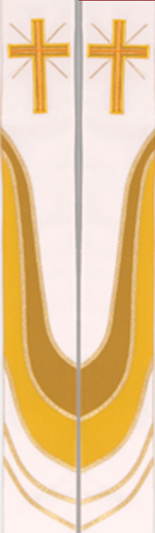 This white stole is part of the Ascension Series of paraments and stoles--all of which are perfect for celebrating the seasons of the Christian year. The stole is made of cathedral fabric and is designed for an Easter celebration. It features a Cross with rays and accent fabric of white, orange, and gold. The stole is 110” x 5”.
