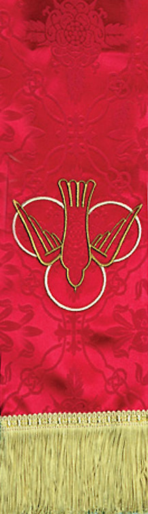 The stole features an embroidered with a descending Dove symbol inside a Trefoil. It has a contoured neck for comfort, decorative fringe at the bottom and is 4 1/2” x 92”.