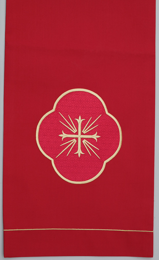 This red Lectern Scarf features a large Greek cross with sunburst design embroidered and outlined in gold. A traditional gold braid trim at the bottom accents the design. Standard measurements are 20” wide x 42” long which includes a 24” front drop.
