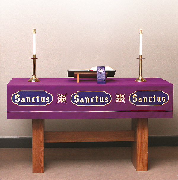 This purple Altar Frontal features the words “Sanctus, Sanctus, Sanctus” (Holy, Holy, Holy) embroidered and outlined in gold. The Greek Cross with sunburst rays provide richness to this striking and modern look given to the traditional symbols. Stock measurements are 72” long x 30” deep, plus a 14” front drop. Made in the USA.