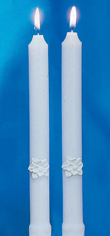 These beautifully decorated side candles from the Holy Matrimony Set are a perfect choice for that special day a couple begins their life together—pair, 7/8” x 10 1/4” side candles. These candles are encased in a decorated plastic bag to keep them in ideal condition. Holy Matrimony Set and Center candles are sold separately.