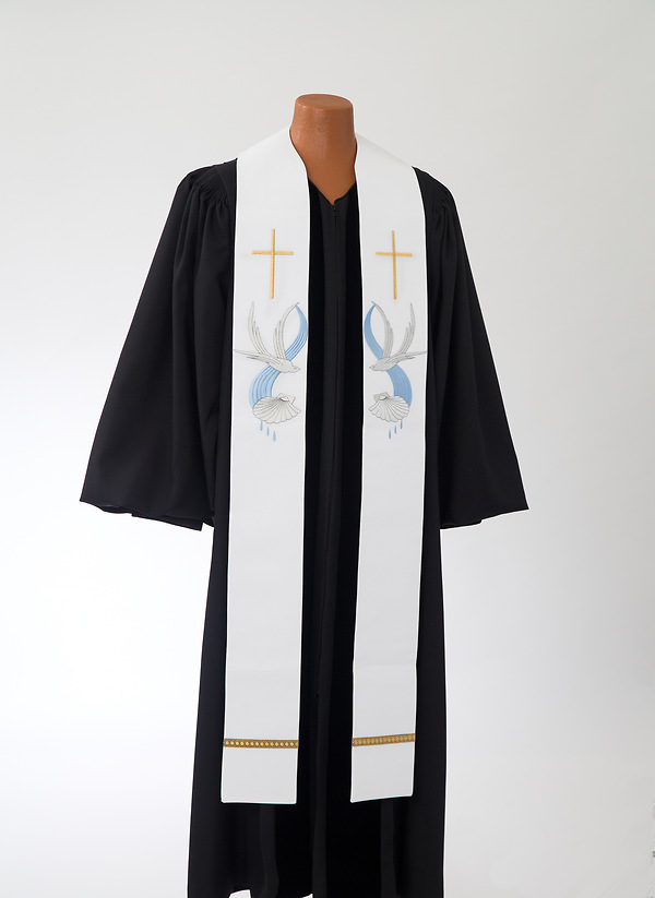 The stole is embroidered with a graceful dove, representing the Holy Spirit; a scallop shell, a symbol of the rite of baptism; and three drops of water, symbolic of the Trinity as well as baptism. It is made of Cathedral fabric and measures 5" x 110". The stole has a contoured neck for comfort.