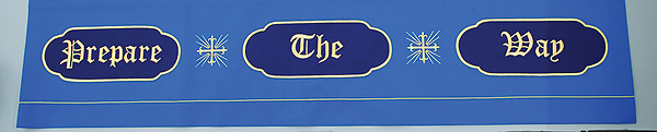 This blue Advent Altar Frontal features the words “Prepare the Way” embroidered and outlined in gold. The Greek Cross with sunburst rays provides richness to this striking and modern look given to the traditional symbols. Standard sizing is 72” long x 30” deep, plus a 14” front drop. Made in USA.