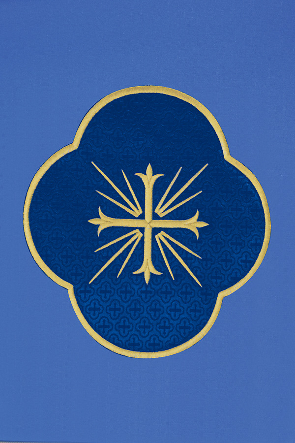 This blue Lectern Scarf features a large Greek cross with sunburst design embroidered and outlined in gold. A traditional gold braid trim at the bottom of it accents the design. Well suited for Advent. Standard measurements are 20” wide x 42” long which includes a 24” front drop. Made in the USA.