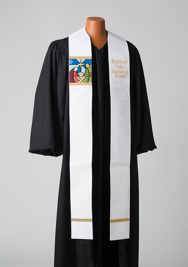 This beautiful white Christmas stole is calling us to "Rejoice! The Savior is Born!". This declaration is beautifully embroidered on the left side of this stole. The holy family appears in vibrant colors on the right side of the stole. Gold ribbon near the bottom adds to the regal feel of this stole. Regular size: 110” long x 5” wide.