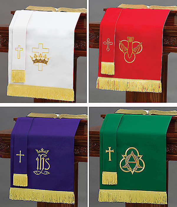 Beautiful colors and excellent embroidery give this reversible ready-made Red/White and Purple/Green Bookmark and Pulpit Scarf Set a custom look. Made of revolutionary Liberty fabric, colorfast and soil resistant, this convenient reversible design lets you display beautiful paraments in each of the four liturgical color, making this an exceptional value and quality set. This set of 4 includes bookmark, 3 1/2" x 36”; and pulpit scarf, 18” x 36”—in red/white and in purple/green; each finished with chainette gold fringe.