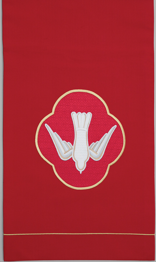 This red Altar Antependia features a white descending dove embroidered in white and outlined in gold. Standard measurements are 30” wide x 60" long which includes a 30” front drop.
