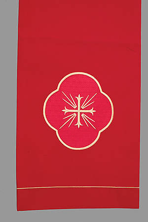 This red Altar Antependia features a gold Greek cross embroidered and outlined in gold. Standard measurements are 30” wide x 60" long which includes a 30” front drop. Made in the USA.