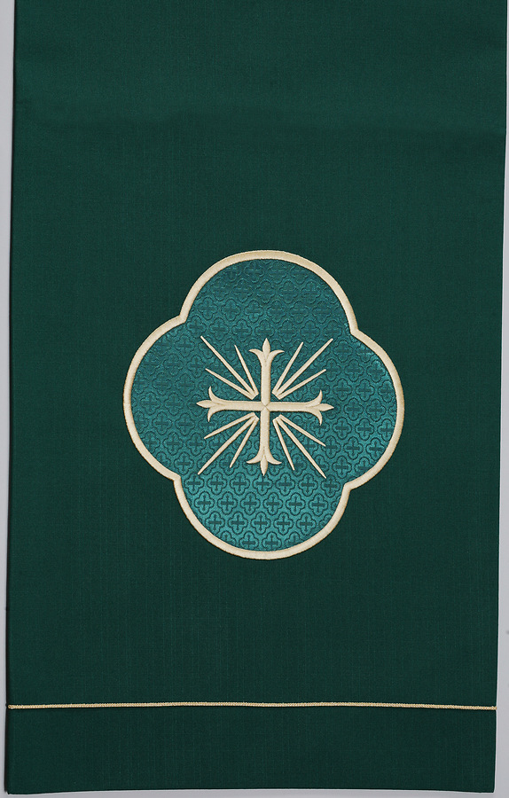 This green Altar Antependia features a Greek Cross design embroidered and outlined in gold. Perfectly suited for ordinary time. Standard measurements are 30” wide x 60" long which includes a 30” front drop. Made in the USA.