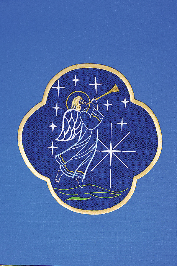 This blue Altar Antependia features an angel design embroidered and outlined in white and gold. Perfectly suited for Advent. Standard measurements are 30” wide x 60" long which includes a 30” front drop. Made in the USA.