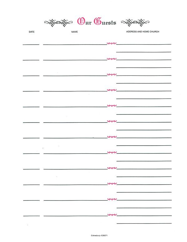 Refill sheets for the Guests of Our Church Book (discontinued) sold in packs of 25. Each sheet has a line for the date, name, address, and home church. 12 lines per side.