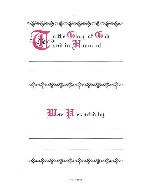 Recognize those who have honored their loved ones with memorial gifts. These Filler Sheets with the heading “To the Glory of God and in Honor of” are in a package of 10 of the same design, and are to be used with the In Remembrance book (discontinued).