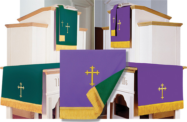 Economically priced, this handsome reversible purple/green bookmark, pulpit scarf, and extra-large communion table runner set offers excellent construction; each piece will retain its shape and beauty for years to come--features machine embroidered gold-colored symbols on 100% polyester polyfaille, strengthened with interlining, and is finished with gold-colored fringe. Both sides of each piece features an embroidered Latin Cross. Made in the USA.