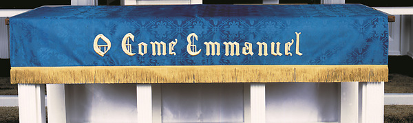Hi-quality altar frontal made of blue Regent Brocade (light weight rayon damask in Clemsford pattern) with embroidered stitching and gold tassels. Made in the USA.