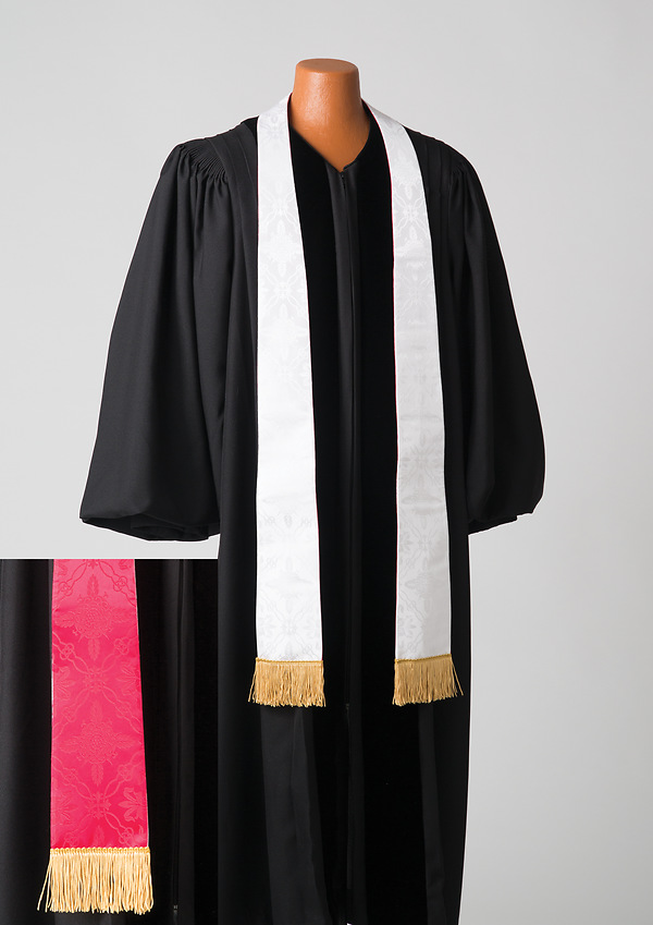 Versatile, and with the beauty and rich appearance of silk damask, yet more affordably priced, this reversible Red/White brocade Stole is perfect for your spiritual occasion. This stole features a gold-fringed edge; 92" long, 4 1/2" wide; tapers to 1 3/4" at the neck.