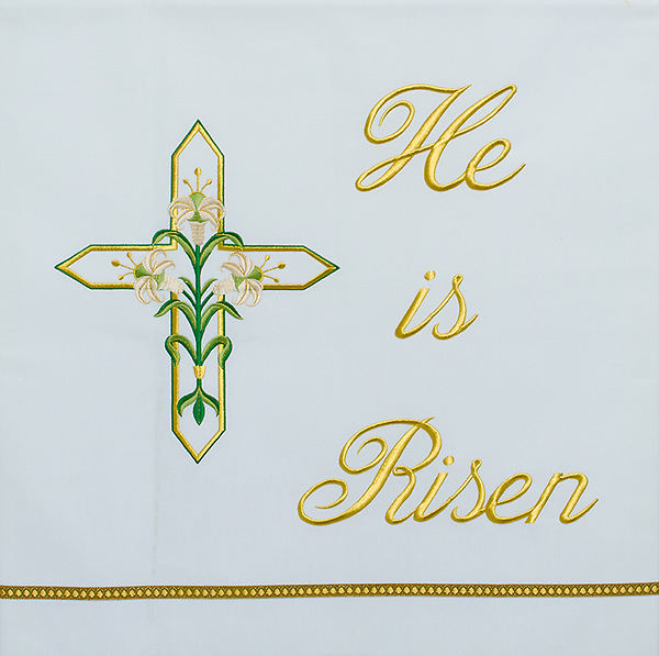 This beautiful altar antependia features "He is Risen" embroidered on cathedral fabric and a beautiful combination of embroidery and applique. Made in the USA.