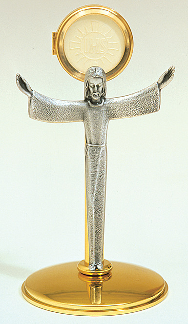 Monstrance - Gold Plated With Oxidized Risen Christ Figure. Secure Acrylic Glass Luna. 2 3/4"., 11" H., 6"W., 5 1/2" "Base.