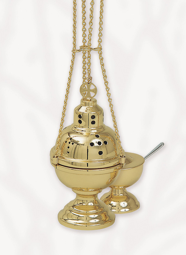 Censer and Boat, Satin Brass, 4 Chains. 8 5/8" H., 4 1/2" Boat. Overall Height 36".
