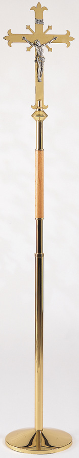 This processional crucifix has a Fleur-de-lis design. It is solid brass with a polished brass finish, and has an oxidized silver corpus and INRI. A break at the node make carring easier. 82" Overall H., 12" base. The cross measures 13"x19"and the carry section is 44"L weighing 6 lbs.