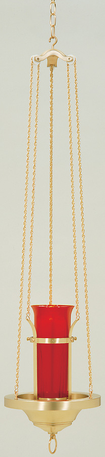 Sanctuary lamp features a polished brass finish. Features a pull down design that drops 32” to allow for easy candle replacement. 42" overall length. Does not require a balance ball.