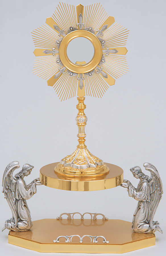 Thabor -24K gold plate, with oxidized silver adoring angels. Overall dimensions: 18 1/2” W., X 9 1/2” D. 8 1/4” H., to throne, 9 1/2” Dia. Table