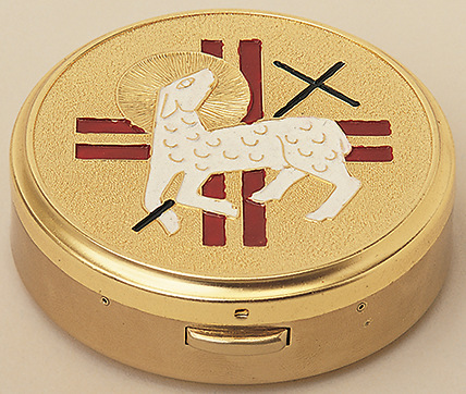 This brass hospital pyx has an enameled lamb and cross on top and is hinged for easier use. It measures 3 1/4" in dia and is 1" deep. It will hold up to 60 hosts.