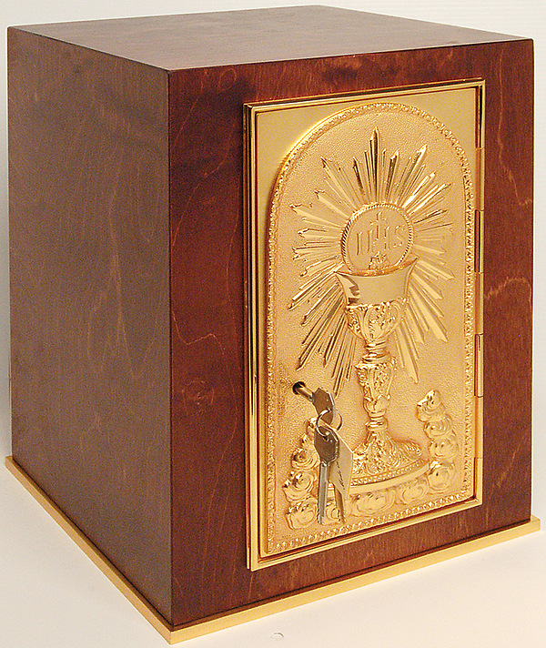 Tabernacle-wood with 24K gold plate door, base frame and interior. Bright gold plated inside. 17” H., X 11 7/8” W. X 11 7/8” D. Door opening 13” H., X 6 1/2” W. 35 lbs.